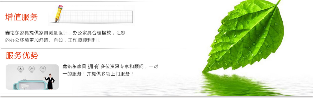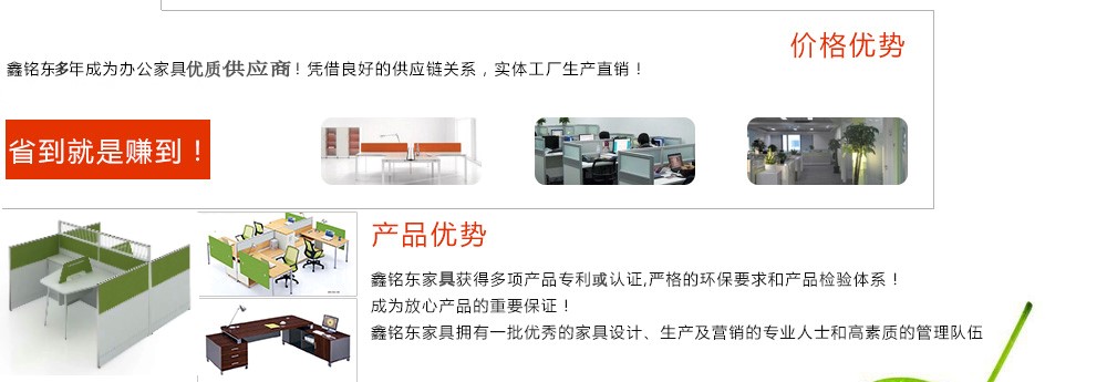 深圳市鑫銘東家具有限公司專(zhuān)業(yè)銷(xiāo)售各類(lèi)辦公家具!產(chǎn)品涉及多種系列,如:班臺(tái)、班椅、屏風(fēng)、會(huì)議桌、會(huì)議椅、辦公沙發(fā)、茶幾、辦公桌、文件柜、電腦桌椅、各式餐臺(tái)、餐椅、書(shū)柜等辦公家具。 鑫銘東家具擁有一批優(yōu)秀的家具設(shè)計(jì)、生產(chǎn)及營(yíng)銷(xiāo)的專(zhuān)業(yè)人士和高素質(zhì)的管理隊(duì)伍。銘東家具以"先難后易"之戰(zhàn)略,在產(chǎn)品結(jié)構(gòu)、產(chǎn)品質(zhì)量及服務(wù)水平方面,均推陳出新,力求完善,精益求精。使我們的產(chǎn)品質(zhì)量保持在國(guó)內(nèi)外家具潮流的先進(jìn)水平,力求滿(mǎn)足客戶(hù)的特殊需求。鑫銘東家具多年來(lái)致力于環(huán)保、實(shí)用家具的設(shè)計(jì)與開(kāi)發(fā),集生產(chǎn)、銷(xiāo)售、服務(wù)于一體。本著"以人為本"的設(shè)計(jì)理念,大量開(kāi)發(fā)符合人體工程學(xué)的各種產(chǎn)品,以"誠(chéng)信為本"的質(zhì)量方針,真材實(shí)料,認(rèn)認(rèn)真真做產(chǎn)品,實(shí)實(shí)在在做人。鑫銘東家具更致力于創(chuàng)造"零維修率"的制造境界,實(shí)現(xiàn)"沒(méi)有維修的服務(wù)才是最好服務(wù)"的口號(hào)》了解更多